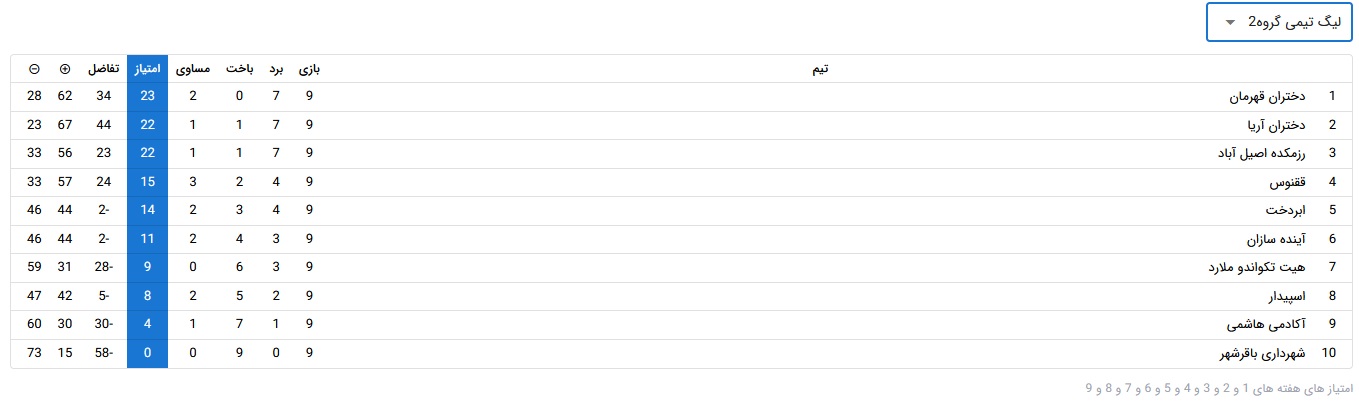 برهمین اساس تیم پارسیا با 8 بردو کسب 24 امتیاز و ناموران با 6 برد و 2 باخت و کسب 18 امتیاز از گروه اول ،دختران قهرمان با 7 بردو 2 تساوی و کسب 23 امتیاز ودختران آریا با کسب 22 امتیاز 7 برد، یک باخت و یک تساوی در گروه دوم موفق شدند به دور نهایی این رقابتها راه یابند .