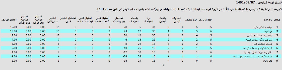 در پایان هفته ششم از گروه اول، تیم لوازم خانگی کن با ۵ برد و کسب ۱۵ امتیاز با دو پله صعود در صدر جدول رده بندی قرار گرفت، فرمانیه با ۵ بردو یک باخت و کسب ۱۵ امتیاز تفاضل ۲۴ دوم شد و لوکس شمشیری با ۴ برد و یک باخت و کسب ۱۲ امتیاز در جایگاه سوم ایستاد.