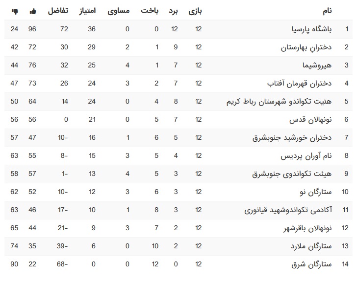 با پایان هفته دوازدهم این رقابتها باشگاه پارسیا با کسب ۳۶ امتیاز همچنان در صدر جدول قرار گرفت، دختران بهارستان با کسب ۲۹ امتیاز رده دوم را به خود اختصاص داد وهیروشیما با کسب ۲۵ امتیاز سوم شد.