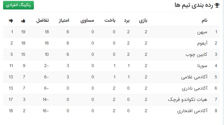 در گروه اول تیمهای آکادمی افتخاری، کابین چوب، سورنا،آکادمی نادری،باشگاه میهن ،هیات تکواندو قرچک ،آکادمی غلامی و آیفوم با یکدیگر به رقابت میپردازند.