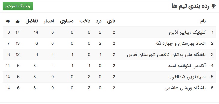 تا پایان هفته دوم، تیم کلینگ زیبایی آذین با ۲ برد و کسب ۶ امتیاز صدرنشین شد، اتحاد بهارستان و چهاردانگه با ۲ برد و ۶ امتیاز و تفاضل ۶ دومی را به خود اختصاص داد و باشگاه ملی پوشان کاظمی شهرستان قدس با یک برد و یک تساوی و کسب ۴ امتیاز در جایگاه سوم ایستاد .