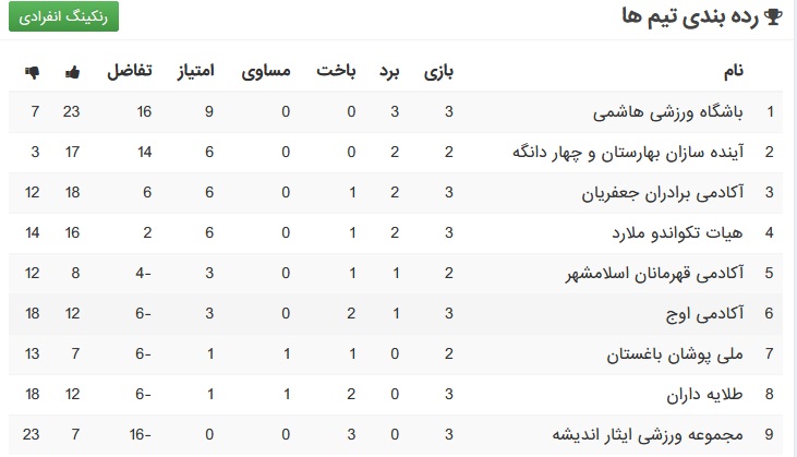 در پایان هفته سوم رقابتهای لیگ غرب تهران در رده کمربندی سبز _ آبی ،تیم باشگاه ورزشی هاشمی با۳ برد و کسب ۹ امتیاز صدرنشین شد، تیم آینده سازان بهارستان و چهاردانگه با ۲ برد و کسب ۶ امتیاز دومی را به خود اختصاص داد و آکادمی برادران جعفریان با ۲ برد و یک باخت و کسب ۶ امتیاز تفاضل ۶ در جایگاه سوم ایستاد.