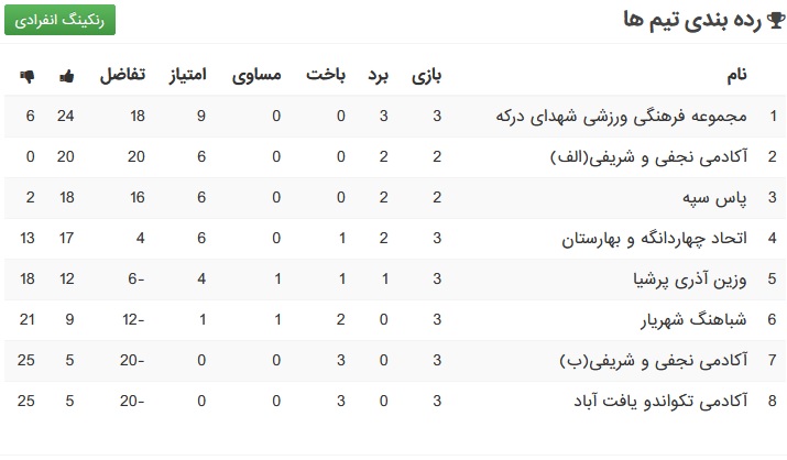 با اتمام مبارزات این هفته،تیم مجموعه فرهنگی ورزشی شهدای درکه با ۳ برد و کسب ۹ امتیاز به صدر جدول رسید،آکادمی نجفی و شریفی ( الف) با ۲ برد و کسب ۶ امتیاز دومی را به خود اختصاص داد و پاس سپه با ۲ برد و کسب ۶ امتیاز و تفاضل ۱۶ در جایگاه سوم قرار گرفت.