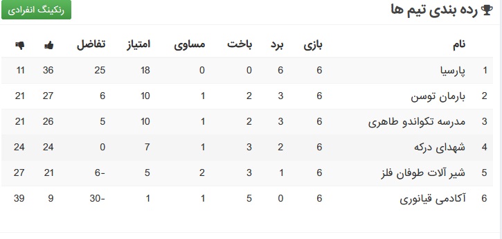 در پایان رقابتهای هفته ششم ، تیم پارسیا با ۶ برد و کسب ۱۸ امتیاز، بارمان توسن با ۳ برد،۲باخت و یک تساوی و کسب ۱۰ امتیاز و مدرسه تکواندو طاهری با ۳برد،۲باخت ،یک تساوی و ۱۰ امتیاز و تفاضل ۵ امتیاز به ترتیب در رده اول تا سوم جدول قرار گرفتند.