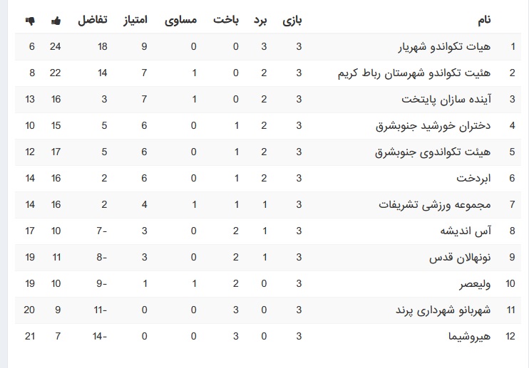 در پایان هفته سوم از رقابتهای لیگ دسته یک نونهالان قرمز _ پوم باشگاهای استان تهران، دختران هیات تکواندو شهریار در صدر جدول رده بندی قرار گرفتند.