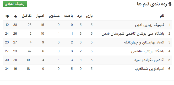 با اتمام مبارزات هفته پنجم ،کلینیک زیبایی آذین با ۵ برد و کسب ۱۵ امتیاز صدرنشینی خود را حفظ کرد،باشگاه ملی پوشان کاظمی شهرستان قدس با ۳ برد ، یک باخت و یک تساوی و کسب ۱۰ امتیاز دوم شد و اتحاد بهارستان و چهاردانگه با ۳ برد و ۲ باخت و کسب ۹ امتیاز در جایگاه سوم جدول رده بندی قرار گرفت.
