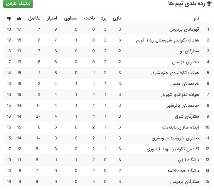 در پایان این رقابتها، تیم قهرمانان پردیس با کسب ۹ امتیاز در صدر جدول رده بندی قرار گرفت، هیات تکواندو شهرستان رباط کریم با کسب ۷ امتیاز در جایگاه دوم ایستاد، ستارگان نو با کسب ۶ امتیاز و دختران قهرمان با ۶ امتیاز تفاضل ۶ به ترتیب در رتبه های سوم و چهارم ایستادند.