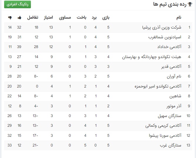 در پایان هفته پنجم ،شرکت وزین پرشیا با کسب ۱۳ امتیاز صدرنشین شد،اسپاد نوین با کسب ۱۳ امتیاز وتفاضل ۱۲ در جایگاه دوم ایستاد و آکادمی خداداد با امتیاز ۱۲، رتبه سومی را به خود اختصاص داد .