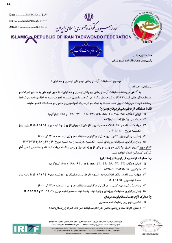 بخشنامه/ مسابقات آزاد تکواندو نوجوانان دختران و پسران