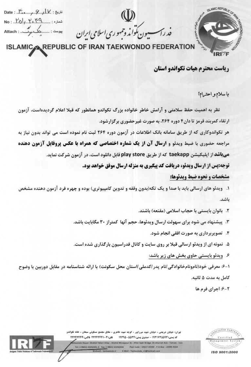 برگزاری آزمون غیر حضوری قرمز تا دان ۴ دوره ۲۶۴