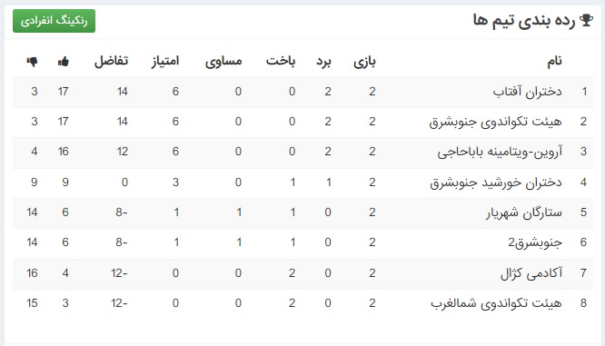 با اتمام مبارزات هفته دوم ،دختران آفتاب و هیات تکواندو جنوب شرق با ۲ برد و با کسب ۶ امتیاز در صدر جدول رده بندی قرار گرفتند ،تیم آروین – ویتامینه باباحاجی با ۲ برد و تفاضل ۱۲ دومی را به خود اختصاص داد و دختران خورشید جنوب شرق با یک برد ، یک باخت و کسب ۳ امتیاز سوم شد.