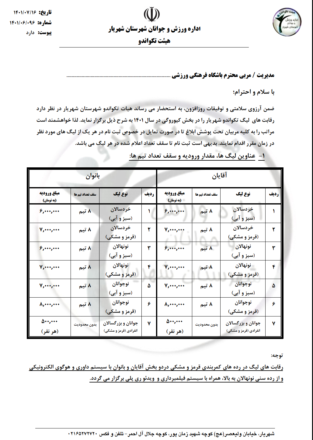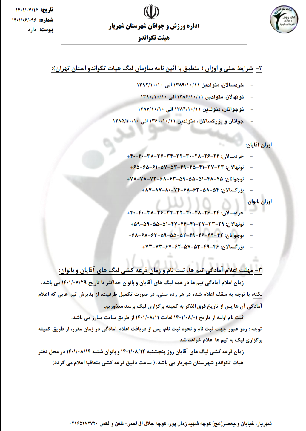بخشنامه اولین دوره مسابقات لیگ تکواندو شهرستان شهریار