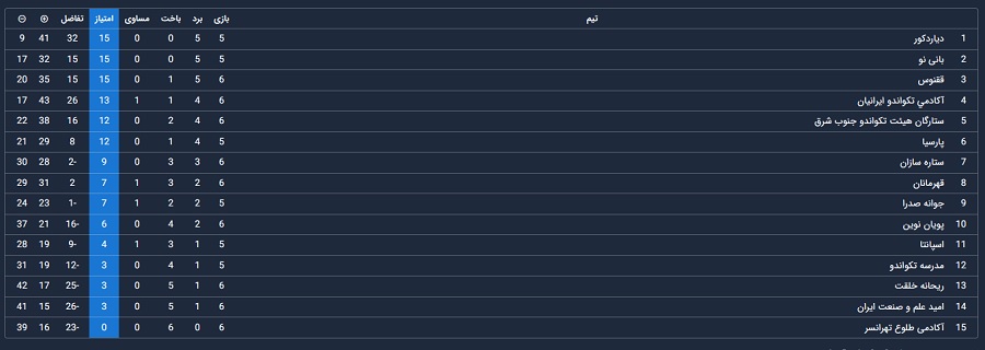 در پایان هفته ششم، دیار دکور با کسب 5 برد و کسب 15 امتیاز تفاضل 31 صدرنشینی خود حفظ کرد، بانی نو با 5 پیروزی و کسب 15 امتیاز تفاضل 10 دومی را به خود اختصاص داد و تیم ققنوس با 5 برد و یک باخت و کسب 15 امتیاز و تفاضل 15 در جایگاه سوم ایستاد .