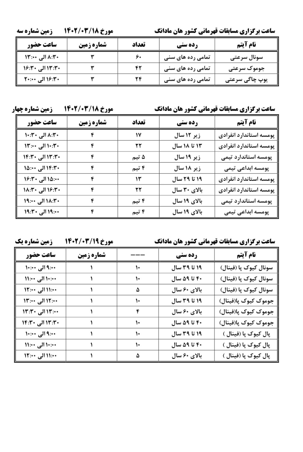 اطلاعیه/زمانبندی مسابقات آزاد قهرمانی هانمادانگ کشوری آقایان