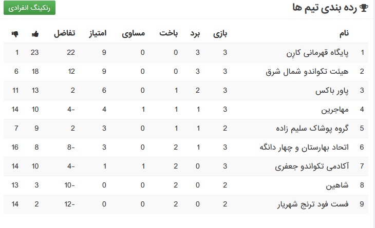 با پایان مبارزات هفته سوم از لیگ برتر تکواندو باشگاههای استان تهران ، تیمهای پایگاه قهرمانی کارن، شمالشرق و پاور باکس موفق شدند به ترتیب رده اول تا سوم جدول رده بندی را به خود اختصاص دهند.