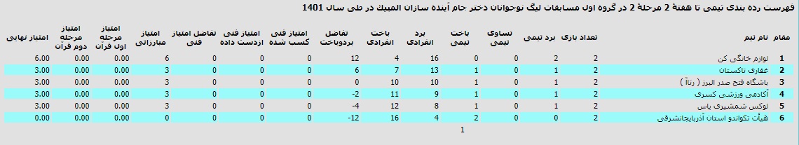 تا پایان هفته دوم از مرحله نهایی این رقابتها ، در لیگ نونهالان تیم لوازم خانگی کن با کسب ۴ امتیاز تفاضل ۲ در جایگاه دوم ایستاد و در لیگ نوجوانان هوگوپوشان لوازم خانگی کن با ۶ امتیاز صدرنشین شد.