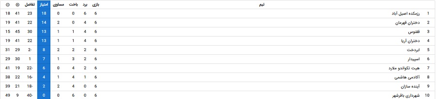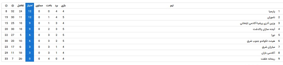 با اتمام مبارزات هفته ششم در گروه اول،تیم پارسیا با 4 برد و کسب 12 امتیاز در صدر جدول رده بندی قرار گرفت، ناموران با 4برد و یک باخت و تفاضل 11 دومی را به خود اختصاص داد و وزین آذری پرشیا_ آکادمی ایلخانی با 3 برد و یک باخت و کسب 9 امتیاز در جایگاه سوم جدول ایستاد.
