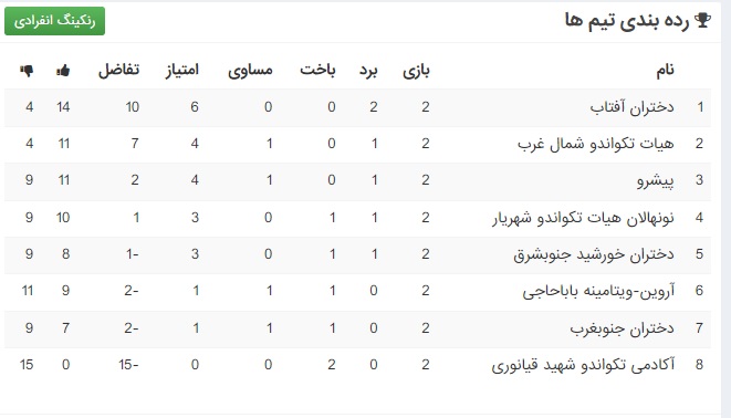 در پایان هفته دوم لیگ برتر نونهالان باشگاههای استان تهران ،تیم دختران آفتاب صدرنشین شد و هیات تکواندو شمال غرب و پیشرو دوم و سومی را به خود اختصاص دادند.