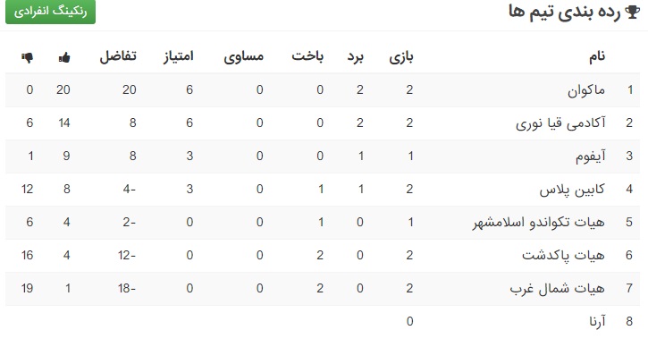 تیمهای “ماکوان، آکادمی قیا نوری، آیفوم، کابین پلاس،هیات تکواندو اسلامشهر،هیات تکواندو پاکدشت، هیات تکواندو شمالغرب و آرنا” در گروه دوم امروز پنجشنبه ۱۴ مهر ماه به مصاف یکدیگر رفتند.