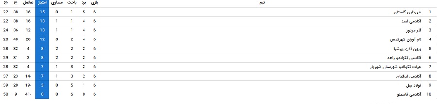 .در پایان هفته ششم ، تیم پسران شهرداری گلستان با ۵ پیروزی و یک باخت، با کسب ۱۵ امتیاز صدرنشینی خود را حفظ کرد.تیم آکادمی امید نیز با ۴ برد، یک باخت و یک تساوی و ۱۳ امتیاز به رتبه دوم جدول ردهبندی صعود کرد. آذر موتور هم با ۴ برد، یک باخت و یک تساوی و ۱۳ امتیاز و تفاضل گل ۱۲، جایگاه سوم را به خود اختصاص داد.