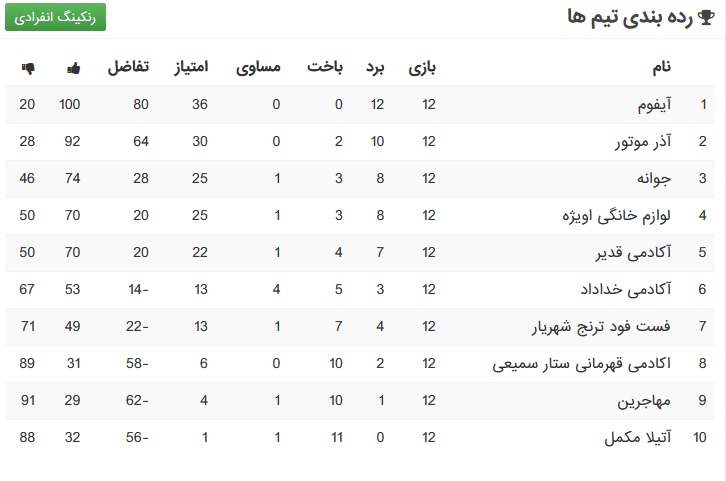 در پایان این رقابتها، تیم آیفوم با ۱۲ برد و کسب ۳۶ امتیاز همچنان در صدر جدول رده بندی ایستاد، اذر موتور با ۱۰ برد و ۲ باخت و کسب ۳۰ امتیاز در جایگاه دوم قرار گرفت،جوانه با ۸ برد، ۳باخت و یک تساوی و کسب ۲۵ امتیاز سوم شد و لوزم خانگی آویژه با ۸ برد،۳ باخت و یک تساوی و کسب ۲۵ امتیاز تفاضل ۲۰ چهارمی را به خوداختصاص داد.