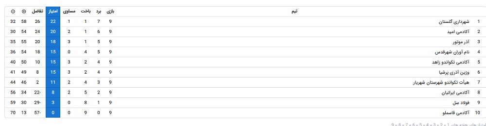 ثبات عملکرد سه تیم مدعی، شهرداری گلستان، آکادمی امید و آذر موتور، در لیگ برتر خردسالان استان تهران ادامه یافت. با پایان هفته نهم، این سه تیم همچنان به ترتیب در جایگاههای اول تا سوم جدول قرار دارند و نشان دادهاند که رقبای سرسختی برای سایر تیمها هستند.