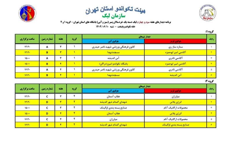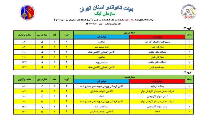 مبارزات هفته سوم و چهارم از رقابتهای لیگ دسته یک خردسالان پسر استان تهران در چهار گروه شنبه ۱۰ شهریور ماه برگزار می شود .