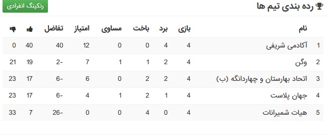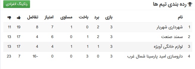 در گروه چهارم نیز ،شهرداری شهریار با ۲برد و یک تساوی و کسب ۷ امتیاز در جایگاه نخست رده بندی قرار گرفت، سمند صنهت با ۲برد و یک باخت و کسب ۶ امتیاز دوم شد و لوازم خانگی آویژه با یک برد،یک باخت و یک تساوی و چهار امتیاز سومی را به خود اختصاص داد.