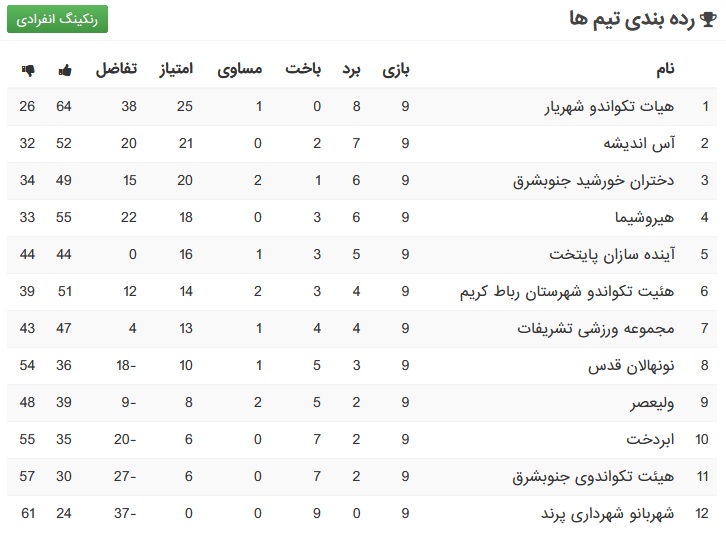 در پایان این رقابتها،هیات تکواندو شهریار با ۸ برد و یک تساوی و کسب ۲۵ امتیاز همچنان صدرنشینی خود را حفظ کرد، آس اندیشه با ۷ برد و ۲ باخت و کسب ۲۱ امتیاز با دو پله صعود در جایگاه دوم ایستاد و دختران خورشید جنوبشرق با ۶برد،یک باخت و ۲ تساوی و کسب ۲۰ امتیاز رتبه سومی را به خود اختصاص داد .