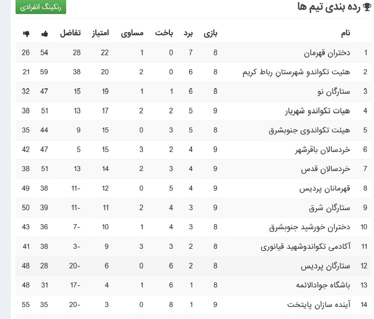 با اتمام رقابتهای هفته ۹ از لیگ دسته یک خردسالان سبز _ آبی باشگاهای استان تهران، دختران قهرمان با دو پله صعودبه صدر جدول رده بندی رسید و هیات تکواندو شهرستان رباط کریم در جایگاه دوم ایستاد.