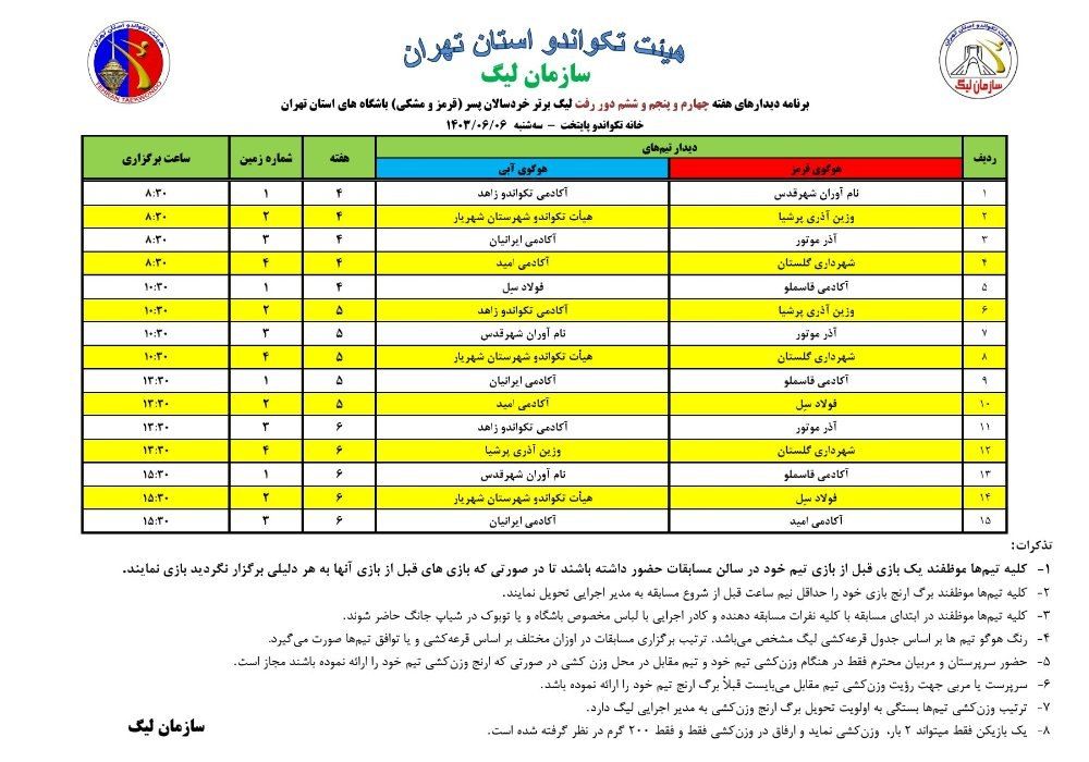 مبارزات هفته چهارم تا ششم لیگ برتر خردسالان پسر استان تهران، ششم شهریور ماه در خانه تکواندو پایتخت برگزار میشود.