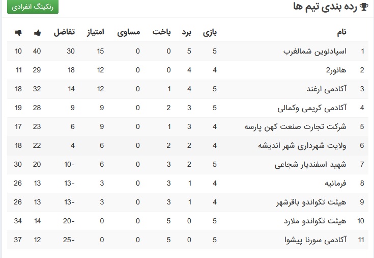 ولایت شهرداری شهر اندیشه ۷_ هیئت تکواندو باقرشهر۳ آکادمی کریمی وکمالی ۹ _ فرمانیه صفر هیئت تکواندو ملارد ۳ _هانور دو ۷ شهید اسفندیار شجاعی یک _ آکادمی ارغند ۹ آکادمی سورنا پیشوا صفر _ اسپادنوین شمالغرب ۱۰ شرکت تجارت صنعت کهن پارسه (قرعه استراحت)