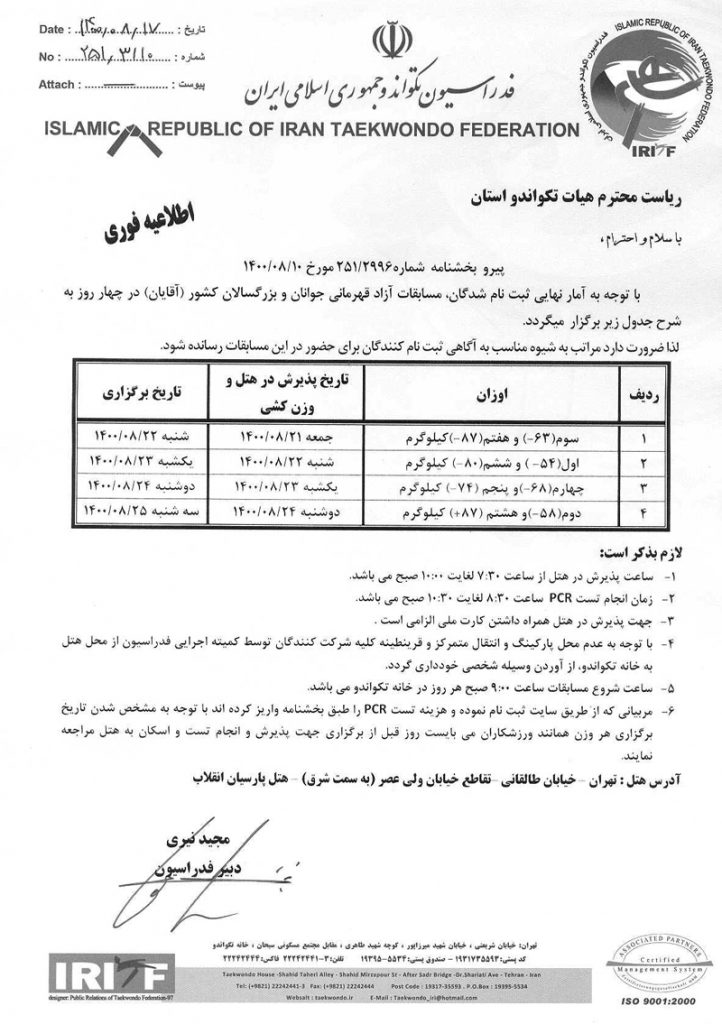 تاریخ برگزاری اوزان مسابقات قهرمانی آزاد کشوری آقایان