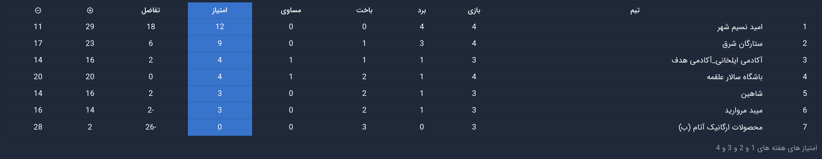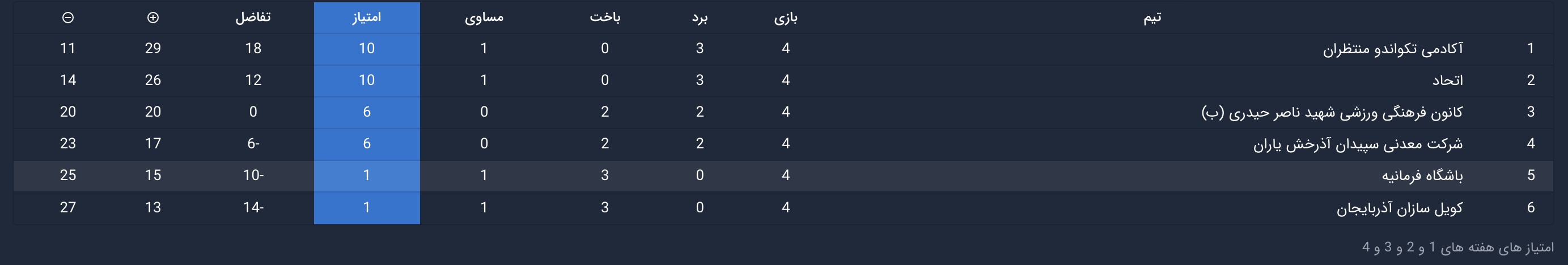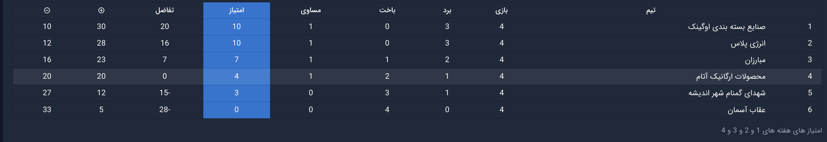 نتایج دیدارهای برگزار شده و رده بندی تیمی تا پایان هفته چهارم به شرح ذیل است ؛
