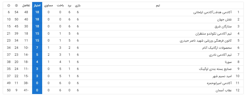 در پایان هفته ششم ،تیم آکادمی هدف_ آکادمی ایلخانی با کسب ۶ پیروزی و ۱۸ امتیار صدرنشینی خود را تثبیت کرد،نقش جهان با کسب ۶ برد و ۱۸ امتیاز و تفاضل 40 و ستارگان شرق نیز با همین امتیاز و تفاضل 30رتبه های دوم و سومی خود را حفظ کردند.
